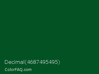 Decimal 4687495495 Color is a very dark green color and the nearest color is Camarone #00581a. Hex code #035223 and RGB value is rgb(3,82,35). In RGB color space, this color is composed of 1% red, 32% green, 14% blue, In CMYK color space, this color is composed of 96% cyan, 0% magenta, 57% yellow , 68% black , In HSL color space, this color has a hue angle of 144° , 93% saturation and 17% lightness.