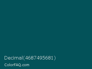 Decimal 4687495681 Color is a very dark cyan color and the nearest color is Deep Sea Green #095859. Hex code #035259 and RGB value is rgb(3,82,89). In RGB color space, this color is composed of 1% red, 32% green, 35% blue, In CMYK color space, this color is composed of 97% cyan, 8% magenta, 0% yellow , 65% black , In HSL color space, this color has a hue angle of 185° , 93% saturation and 18% lightness.