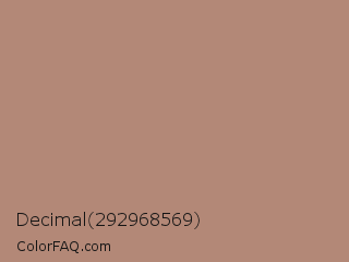 Decimal 292968569 Color is a normal orange color and the nearest color is Light Taupe #b38b6d. Hex code #b38877 and RGB value is rgb(179,136,119). In RGB color space, this color is composed of 70% red, 53% green, 47% blue, In CMYK color space, this color is composed of 0% cyan, 24% magenta, 34% yellow , 30% black , In HSL color space, this color has a hue angle of 17° , 28% saturation and 58% lightness.