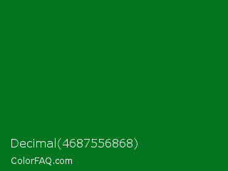 Decimal 4687556868 Color is a dark green color and the nearest color is La Salle Green #087830. Hex code #037520 and RGB value is rgb(3,117,32). In RGB color space, this color is composed of 1% red, 46% green, 13% blue, In CMYK color space, this color is composed of 97% cyan, 0% magenta, 73% yellow , 54% black , In HSL color space, this color has a hue angle of 135° , 95% saturation and 24% lightness.