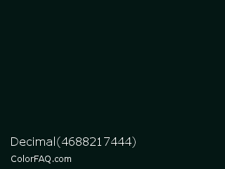 Decimal 4688217444 Color is a almost black cyan color and the nearest color is Black Bean #081910. Hex code #041714 and RGB value is rgb(4,23,20). In RGB color space, this color is composed of 2% red, 9% green, 8% blue, In CMYK color space, this color is composed of 83% cyan, 0% magenta, 13% yellow , 91% black , In HSL color space, this color has a hue angle of 171° , 70% saturation and 5% lightness.
