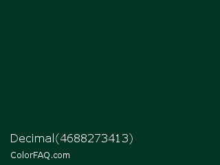 Decimal 4688273413 Color is a very dark green color and the nearest color is Bottle Green #093624. Hex code #043425 and RGB value is rgb(4,52,37). In RGB color space, this color is composed of 2% red, 20% green, 15% blue, In CMYK color space, this color is composed of 92% cyan, 0% magenta, 29% yellow , 80% black , In HSL color space, this color has a hue angle of 161° , 86% saturation and 11% lightness.