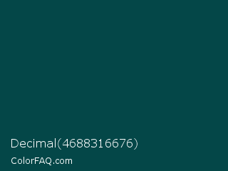 Decimal 4688316676 Color is a very dark cyan color and the nearest color is Deep Jungle Green #004b49. Hex code #044748 and RGB value is rgb(4,71,72). In RGB color space, this color is composed of 2% red, 28% green, 28% blue, In CMYK color space, this color is composed of 94% cyan, 1% magenta, 0% yellow , 72% black , In HSL color space, this color has a hue angle of 181° , 89% saturation and 15% lightness.