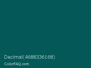 Decimal 4688336168 Color is a very dark cyan color and the nearest color is Deep Sea Green #095859. Hex code #045958 and RGB value is rgb(4,89,88). In RGB color space, this color is composed of 2% red, 35% green, 35% blue, In CMYK color space, this color is composed of 96% cyan, 0% magenta, 1% yellow , 65% black , In HSL color space, this color has a hue angle of 179° , 91% saturation and 18% lightness.
