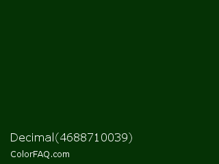 Decimal 4688710039 Color is a very dark green color and the nearest color is Deep Fir #002900. Hex code #053205 and RGB value is rgb(5,50,5). In RGB color space, this color is composed of 2% red, 20% green, 2% blue, In CMYK color space, this color is composed of 90% cyan, 0% magenta, 90% yellow , 80% black , In HSL color space, this color has a hue angle of 120° , 82% saturation and 11% lightness.