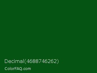 Decimal 4688746262 Color is a very dark green color and the nearest color is Camarone #00581a. Hex code #055414 and RGB value is rgb(5,84,20). In RGB color space, this color is composed of 2% red, 33% green, 8% blue, In CMYK color space, this color is composed of 94% cyan, 0% magenta, 76% yellow , 67% black , In HSL color space, this color has a hue angle of 131° , 89% saturation and 17% lightness.
