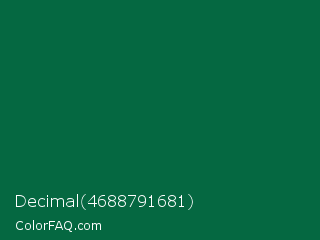Decimal 4688791681 Color is a very dark green color and the nearest color is Cadmium Green #006b3c. Hex code #056841 and RGB value is rgb(5,104,65). In RGB color space, this color is composed of 2% red, 41% green, 25% blue, In CMYK color space, this color is composed of 95% cyan, 0% magenta, 38% yellow , 59% black , In HSL color space, this color has a hue angle of 156° , 91% saturation and 21% lightness.