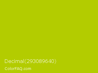 Decimal 293089640 Color is a normal yellow color and the nearest color is Rio Grande #bbd009. Hex code #b3cc00 and RGB value is rgb(179,204,0). In RGB color space, this color is composed of 70% red, 80% green, 0% blue, In CMYK color space, this color is composed of 12% cyan, 0% magenta, 100% yellow , 20% black , In HSL color space, this color has a hue angle of 67° , 100% saturation and 40% lightness.