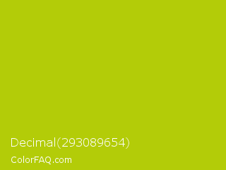 Decimal 293089654 Color is a normal yellow color and the nearest color is Rio Grande #bbd009. Hex code #b3cc08 and RGB value is rgb(179,204,8). In RGB color space, this color is composed of 70% red, 80% green, 3% blue, In CMYK color space, this color is composed of 12% cyan, 0% magenta, 96% yellow , 20% black , In HSL color space, this color has a hue angle of 68° , 92% saturation and 42% lightness.