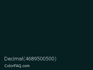 Decimal 4689500500 Color is a almost black cyan color and the nearest color is Swamp #001b1c. Hex code #062022 and RGB value is rgb(6,32,34). In RGB color space, this color is composed of 2% red, 13% green, 13% blue, In CMYK color space, this color is composed of 82% cyan, 6% magenta, 0% yellow , 87% black , In HSL color space, this color has a hue angle of 184° , 70% saturation and 8% lightness.