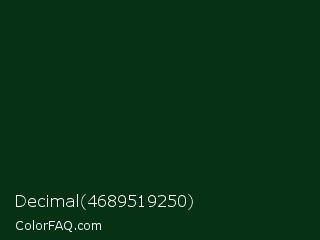 Decimal 4689519250 Color is a very dark green color and the nearest color is English Holly #022d15. Hex code #063114 and RGB value is rgb(6,49,20). In RGB color space, this color is composed of 2% red, 19% green, 8% blue, In CMYK color space, this color is composed of 88% cyan, 0% magenta, 59% yellow , 81% black , In HSL color space, this color has a hue angle of 140° , 78% saturation and 11% lightness.