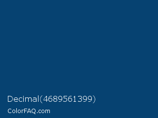 Decimal 4689561399 Color is a dark blue color and the nearest color is Regal Blue #013f6a. Hex code #064271 and RGB value is rgb(6,66,113). In RGB color space, this color is composed of 2% red, 26% green, 44% blue, In CMYK color space, this color is composed of 95% cyan, 42% magenta, 0% yellow , 56% black , In HSL color space, this color has a hue angle of 206° , 90% saturation and 23% lightness.