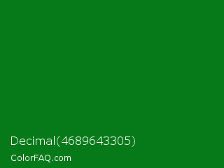 Decimal 4689643305 Color is a dark green color and the nearest color is La Salle Green #087830. Hex code #067919 and RGB value is rgb(6,121,25). In RGB color space, this color is composed of 2% red, 47% green, 10% blue, In CMYK color space, this color is composed of 95% cyan, 0% magenta, 79% yellow , 53% black , In HSL color space, this color has a hue angle of 130° , 91% saturation and 25% lightness.