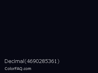 Decimal 4690285361 Color is a almost black blue color and the nearest color is Rich Black FOGRA29 #010b13. Hex code #070813 and RGB value is rgb(7,8,19). In RGB color space, this color is composed of 3% red, 3% green, 7% blue, In CMYK color space, this color is composed of 63% cyan, 58% magenta, 0% yellow , 93% black , In HSL color space, this color has a hue angle of 235° , 46% saturation and 5% lightness.