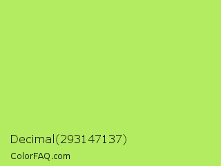 Decimal 293147137 Color is a light green color and the nearest color is Inchworm #b2ec5d. Hex code #b3eb61 and RGB value is rgb(179,235,97). In RGB color space, this color is composed of 70% red, 92% green, 38% blue, In CMYK color space, this color is composed of 24% cyan, 0% magenta, 59% yellow , 8% black , In HSL color space, this color has a hue angle of 84° , 78% saturation and 65% lightness.