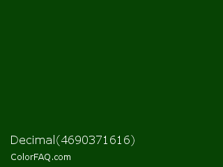 Decimal 4690371616 Color is a very dark green color and the nearest color is Dark Fern #0a480d. Hex code #074304 and RGB value is rgb(7,67,4). In RGB color space, this color is composed of 3% red, 26% green, 2% blue, In CMYK color space, this color is composed of 90% cyan, 0% magenta, 94% yellow , 74% black , In HSL color space, this color has a hue angle of 117° , 89% saturation and 14% lightness.