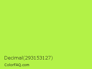 Decimal 293153127 Color is a light green color and the nearest color is Inchworm #b2ec5d. Hex code #b3f247 and RGB value is rgb(179,242,71). In RGB color space, this color is composed of 70% red, 95% green, 28% blue, In CMYK color space, this color is composed of 26% cyan, 0% magenta, 71% yellow , 5% black , In HSL color space, this color has a hue angle of 82° , 87% saturation and 61% lightness.