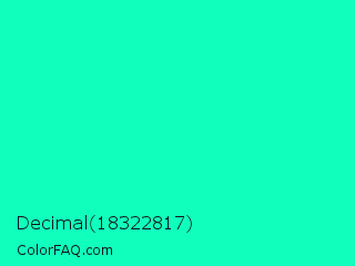 Decimal 18322817 Color is a normal green color and the nearest color is Medium Spring Green #00fa9a. Hex code #11ffbd and RGB value is rgb(17,255,189). In RGB color space, this color is composed of 7% red, 100% green, 74% blue, In CMYK color space, this color is composed of 93% cyan, 0% magenta, 26% yellow , 0% black , In HSL color space, this color has a hue angle of 163° , 100% saturation and 53% lightness.