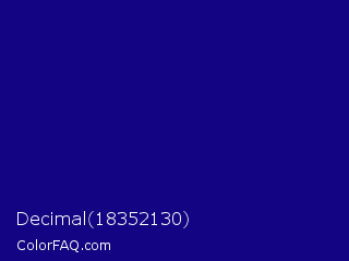 Decimal 18352130 Color is a dark indigo color and the nearest color is Ultramarine #120a8f. Hex code #120482 and RGB value is rgb(18,4,130). In RGB color space, this color is composed of 7% red, 2% green, 51% blue, In CMYK color space, this color is composed of 86% cyan, 97% magenta, 0% yellow , 49% black , In HSL color space, this color has a hue angle of 247° , 94% saturation and 26% lightness.