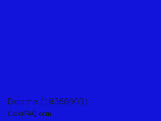 Decimal 18368903 Color is a normal blue color and the nearest color is Bluebonnet #1c1cf0. Hex code #1214db and RGB value is rgb(18,20,219). In RGB color space, this color is composed of 7% red, 8% green, 86% blue, In CMYK color space, this color is composed of 92% cyan, 91% magenta, 0% yellow , 14% black , In HSL color space, this color has a hue angle of 239° , 85% saturation and 46% lightness.