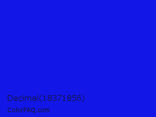 Decimal 18371856 Color is a normal blue color and the nearest color is Bluebonnet #1c1cf0. Hex code #1216e6 and RGB value is rgb(18,22,230). In RGB color space, this color is composed of 7% red, 9% green, 90% blue, In CMYK color space, this color is composed of 92% cyan, 90% magenta, 0% yellow , 10% black , In HSL color space, this color has a hue angle of 239° , 85% saturation and 49% lightness.