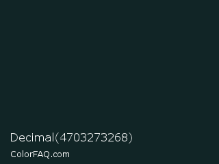 Decimal 4703273268 Color is a very dark cyan color and the nearest color is Dark Jungle Green #1a2421. Hex code #112526 and RGB value is rgb(17,37,38). In RGB color space, this color is composed of 7% red, 15% green, 15% blue, In CMYK color space, this color is composed of 55% cyan, 3% magenta, 0% yellow , 85% black , In HSL color space, this color has a hue angle of 183° , 38% saturation and 11% lightness.