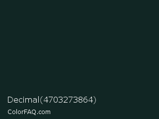 Decimal 4703273864 Color is a very dark cyan color and the nearest color is Dark Jungle Green #1a2421. Hex code #112624 and RGB value is rgb(17,38,36). In RGB color space, this color is composed of 7% red, 15% green, 14% blue, In CMYK color space, this color is composed of 55% cyan, 0% magenta, 5% yellow , 85% black , In HSL color space, this color has a hue angle of 174° , 38% saturation and 11% lightness.