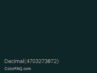 Decimal 4703273872 Color is a very dark cyan color and the nearest color is Dark Jungle Green #1a2421. Hex code #112626 and RGB value is rgb(17,38,38). In RGB color space, this color is composed of 7% red, 15% green, 15% blue, In CMYK color space, this color is composed of 55% cyan, 0% magenta, 0% yellow , 85% black , In HSL color space, this color has a hue angle of 180° , 38% saturation and 11% lightness.