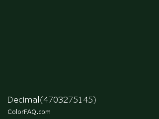 Decimal 4703275145 Color is a very dark green color and the nearest color is Bush #0d2e1c. Hex code #112819 and RGB value is rgb(17,40,25). In RGB color space, this color is composed of 7% red, 16% green, 10% blue, In CMYK color space, this color is composed of 58% cyan, 0% magenta, 38% yellow , 84% black , In HSL color space, this color has a hue angle of 141° , 40% saturation and 11% lightness.