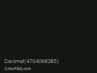 Decimal 4704068385 Color is a almost black green color and the nearest color is Racing Green #0c1911. Hex code #121811 and RGB value is rgb(18,24,17). In RGB color space, this color is composed of 7% red, 9% green, 7% blue, In CMYK color space, this color is composed of 25% cyan, 0% magenta, 29% yellow , 91% black , In HSL color space, this color has a hue angle of 111° , 17% saturation and 8% lightness.