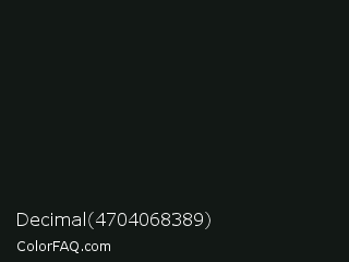 Decimal 4704068389 Color is a almost black green color and the nearest color is Racing Green #0c1911. Hex code #121815 and RGB value is rgb(18,24,21). In RGB color space, this color is composed of 7% red, 9% green, 8% blue, In CMYK color space, this color is composed of 25% cyan, 0% magenta, 13% yellow , 91% black , In HSL color space, this color has a hue angle of 150° , 14% saturation and 8% lightness.