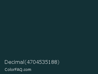 Decimal 4704535188 Color is a very dark cyan color and the nearest color is Gable Green #163531. Hex code #133136 and RGB value is rgb(19,49,54). In RGB color space, this color is composed of 7% red, 19% green, 21% blue, In CMYK color space, this color is composed of 65% cyan, 9% magenta, 0% yellow , 79% black , In HSL color space, this color has a hue angle of 189° , 48% saturation and 14% lightness.