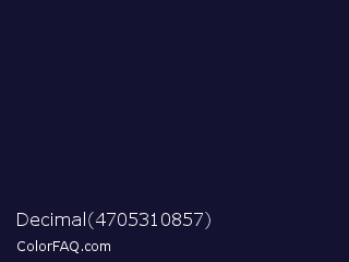 Decimal 4705310857 Color is a very dark indigo color and the nearest color is Haiti #1b1035. Hex code #141231 and RGB value is rgb(20,18,49). In RGB color space, this color is composed of 8% red, 7% green, 19% blue, In CMYK color space, this color is composed of 59% cyan, 63% magenta, 0% yellow , 81% black , In HSL color space, this color has a hue angle of 244° , 46% saturation and 13% lightness.