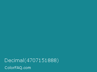 Decimal 4707151888 Color is a normal cyan color and the nearest color is Blue Chill #0c8990. Hex code #168792 and RGB value is rgb(22,135,146). In RGB color space, this color is composed of 9% red, 53% green, 57% blue, In CMYK color space, this color is composed of 85% cyan, 8% magenta, 0% yellow , 43% black , In HSL color space, this color has a hue angle of 185° , 74% saturation and 33% lightness.