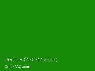 Decimal 4707152773 Color is a dark green color and the nearest color is India Green #138808. Hex code #168909 and RGB value is rgb(22,137,9). In RGB color space, this color is composed of 9% red, 54% green, 4% blue, In CMYK color space, this color is composed of 84% cyan, 0% magenta, 93% yellow , 46% black , In HSL color space, this color has a hue angle of 114° , 88% saturation and 29% lightness.