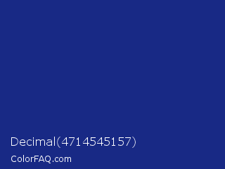 Decimal 4714545157 Color is a normal blue color and the nearest color is Jacksons Purple #20208d. Hex code #182985 and RGB value is rgb(24,41,133). In RGB color space, this color is composed of 9% red, 16% green, 52% blue, In CMYK color space, this color is composed of 82% cyan, 69% magenta, 0% yellow , 48% black , In HSL color space, this color has a hue angle of 231° , 69% saturation and 31% lightness.