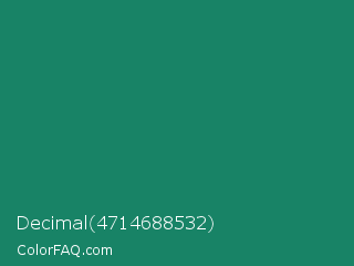 Decimal 4714688532 Color is a dark cyan color and the nearest color is Deep Green Cyan Turquoise #0e7c61. Hex code #188366 and RGB value is rgb(24,131,102). In RGB color space, this color is composed of 9% red, 51% green, 40% blue, In CMYK color space, this color is composed of 82% cyan, 0% magenta, 22% yellow , 49% black , In HSL color space, this color has a hue angle of 164° , 69% saturation and 30% lightness.