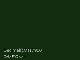 Decimal 18417960 Color is a very dark green color and the nearest color is Deep Forest Green #182d09. Hex code #122c10 and RGB value is rgb(18,44,16). In RGB color space, this color is composed of 7% red, 17% green, 6% blue, In CMYK color space, this color is composed of 59% cyan, 0% magenta, 64% yellow , 83% black , In HSL color space, this color has a hue angle of 116° , 47% saturation and 12% lightness.