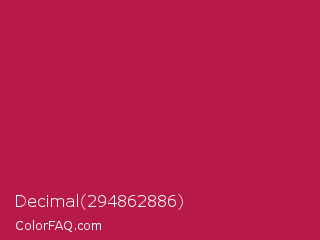 Decimal 294862886 Color is a normal rose color and the nearest color is French Wine #ac1e44. Hex code #b6194a and RGB value is rgb(182,25,74). In RGB color space, this color is composed of 71% red, 10% green, 29% blue, In CMYK color space, this color is composed of 0% cyan, 86% magenta, 59% yellow , 29% black , In HSL color space, this color has a hue angle of 341° , 76% saturation and 41% lightness.