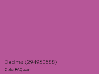 Decimal 294950688 Color is a normal magenta color and the nearest color is Pearly Purple #b768a2. Hex code #b65698 and RGB value is rgb(182,86,152). In RGB color space, this color is composed of 71% red, 34% green, 60% blue, In CMYK color space, this color is composed of 0% cyan, 53% magenta, 16% yellow , 29% black , In HSL color space, this color has a hue angle of 319° , 40% saturation and 53% lightness.