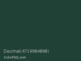 Decimal 4719984898 Color is a very dark green color and the nearest color is Te Papa Green #1e433c. Hex code #204036 and RGB value is rgb(32,64,54). In RGB color space, this color is composed of 13% red, 25% green, 21% blue, In CMYK color space, this color is composed of 50% cyan, 0% magenta, 16% yellow , 75% black , In HSL color space, this color has a hue angle of 161° , 33% saturation and 19% lightness.