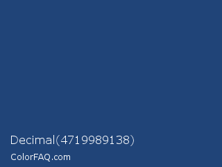Decimal 4719989138 Color is a dark blue color and the nearest color is Astronaut #283a77. Hex code #204478 and RGB value is rgb(32,68,120). In RGB color space, this color is composed of 13% red, 27% green, 47% blue, In CMYK color space, this color is composed of 73% cyan, 43% magenta, 0% yellow , 53% black , In HSL color space, this color has a hue angle of 215° , 58% saturation and 30% lightness.