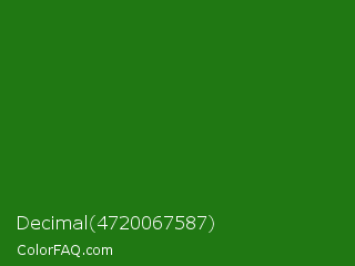 Decimal 4720067587 Color is a dark green color and the nearest color is Bilbao #327c14. Hex code #207813 and RGB value is rgb(32,120,19). In RGB color space, this color is composed of 13% red, 47% green, 7% blue, In CMYK color space, this color is composed of 73% cyan, 0% magenta, 84% yellow , 53% black , In HSL color space, this color has a hue angle of 112° , 73% saturation and 27% lightness.