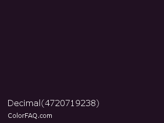 Decimal 4720719238 Color is a very dark magenta color and the nearest color is Eerie Black #1b1b1b. Hex code #211122 and RGB value is rgb(33,17,34). In RGB color space, this color is composed of 13% red, 7% green, 13% blue, In CMYK color space, this color is composed of 3% cyan, 50% magenta, 0% yellow , 87% black , In HSL color space, this color has a hue angle of 296° , 33% saturation and 10% lightness.