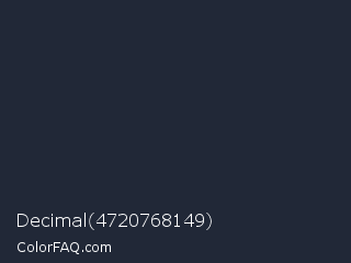 Decimal 4720768149 Color is a very dark blue color and the nearest color is Ebony Clay #26283b. Hex code #212837 and RGB value is rgb(33,40,55). In RGB color space, this color is composed of 13% red, 16% green, 22% blue, In CMYK color space, this color is composed of 40% cyan, 27% magenta, 0% yellow , 78% black , In HSL color space, this color has a hue angle of 221° , 25% saturation and 17% lightness.