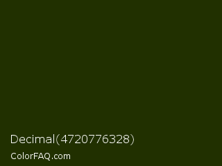 Decimal 4720776328 Color is a almost black lime color and the nearest color is Deep Forest Green #182d09. Hex code #213000 and RGB value is rgb(33,48,0). In RGB color space, this color is composed of 13% red, 19% green, 0% blue, In CMYK color space, this color is composed of 31% cyan, 0% magenta, 100% yellow , 81% black , In HSL color space, this color has a hue angle of 79° , 100% saturation and 9% lightness.