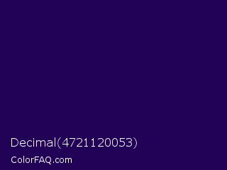 Decimal 4721120053 Color is a very dark violet color and the nearest color is Cherry Pie #2a0359. Hex code #220257 and RGB value is rgb(34,2,87). In RGB color space, this color is composed of 13% red, 1% green, 34% blue, In CMYK color space, this color is composed of 61% cyan, 98% magenta, 0% yellow , 66% black , In HSL color space, this color has a hue angle of 263° , 96% saturation and 17% lightness.