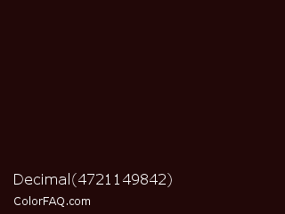 Decimal 4721149842 Color is a almost black red color and the nearest color is Kilamanjaro #240c02. Hex code #220808 and RGB value is rgb(34,8,8). In RGB color space, this color is composed of 13% red, 3% green, 3% blue, In CMYK color space, this color is composed of 0% cyan, 76% magenta, 76% yellow , 87% black , In HSL color space, this color has a hue angle of 0° , 62% saturation and 8% lightness.