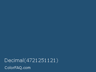 Decimal 4721251121 Color is a dark blue color and the nearest color is Chathams Blue #175579. Hex code #225073 and RGB value is rgb(34,80,115). In RGB color space, this color is composed of 13% red, 31% green, 45% blue, In CMYK color space, this color is composed of 70% cyan, 30% magenta, 0% yellow , 55% black , In HSL color space, this color has a hue angle of 206° , 54% saturation and 29% lightness.