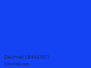 Decimal 18444357 Color is a normal blue color and the nearest color is Blue RYB #0247fe. Hex code #1243f5 and RGB value is rgb(18,67,245). In RGB color space, this color is composed of 7% red, 26% green, 96% blue, In CMYK color space, this color is composed of 93% cyan, 73% magenta, 0% yellow , 4% black , In HSL color space, this color has a hue angle of 227° , 92% saturation and 52% lightness.